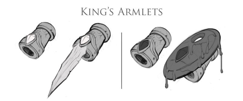 Ci-dessus, un croquis préparatoire de ses accessoires principaux : "Les Bracelets du Roi" intégrant une épee de cristal et un bouclier de peinture noire.