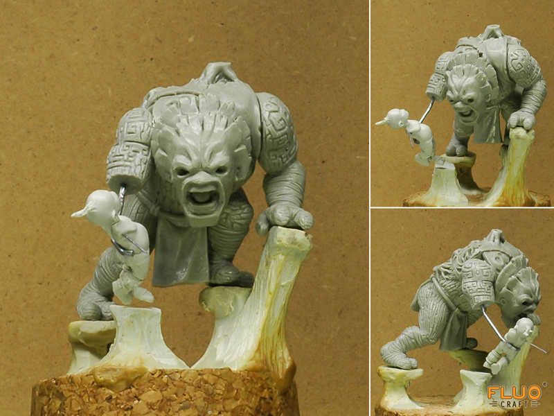 La version domestiquée et finalisée et nous sommes dans la dernière ligne droite de la sculpture de cette pièce monumentale avec la version sauvage qui signe le lancement de la gamme “Monstres” sur base 50mm (j'en reparlerai ci-dessous). Nous pouvons apercevoir le scole texturé sur cette photo ainsi que le second bracelet en pierre. Christophe travaille actuellement sur le bras droit de la version sauvage avec le guerrier dans la main. Il lui restera à sculpter la seconde tête et quelques petits éléments alternatifs.