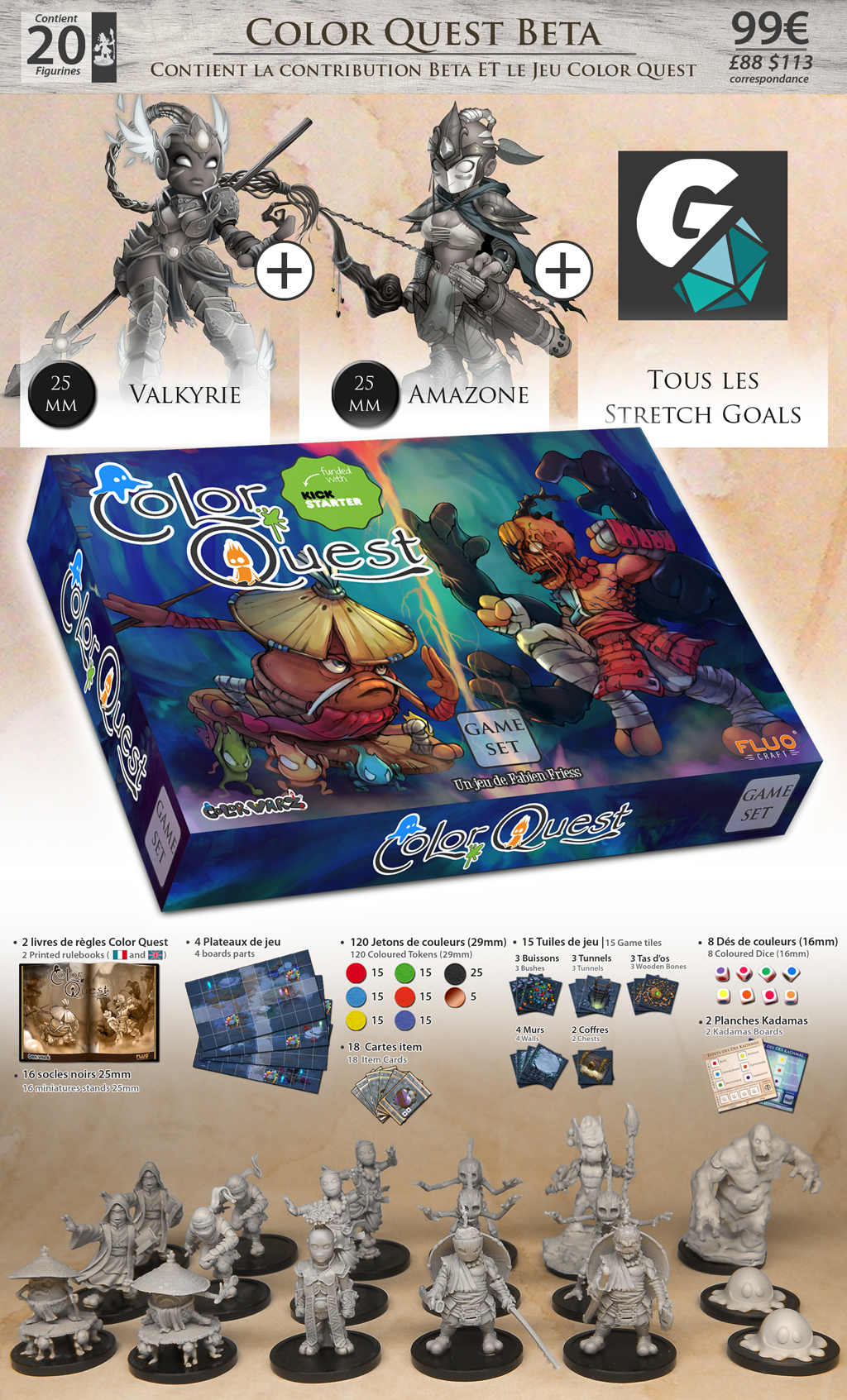 Cette offre implique : Le jeu Color Quest + le pack Alpha (Matriarche Possédée, Chef Possédé et Élu lvl2) + les 3 Monstres sur socle 50mm pour 216€ fdp out.
