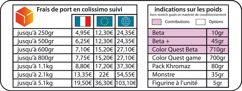 Nous avons décidé d'opter pour le format Colissimo de La Poste pour assurer la livraison de nos colis. C'est un produit que nous maîtrisons et que nous utilisons régulièrement. Les frais de port seront incrémentés automatiquement en fonction de ce que vous décidez d'ajouter (ou pas) dans votre contribution. Les colis seront préparés avec soin et expédié par FLUO Craft. Je vous invite à consulter les retours des contributeurs de l'édition précédente (Color Quest Alpha) pour avoir un avis sur la qualité des envoies.