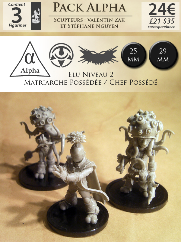 - Le pack "Alpha" qui reprendra les 3 figurines de l'édition précédente pour 24€ à savoir : la Matriarche Possédée, Le Chef Possédé et l’Élu niveau 2