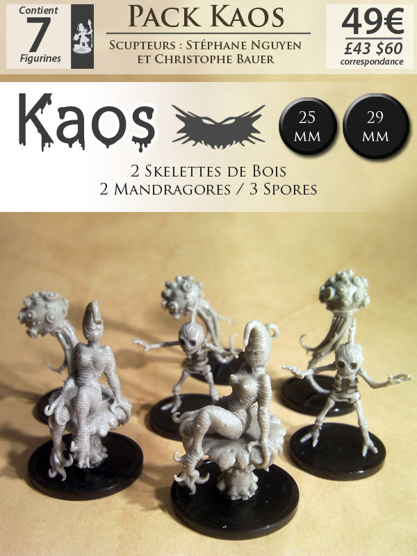 - Un pack "Kaos" contenant 7 figurines pour 49€ et contenant : 3 Spores, 2 Mandragores et 2 Skelettes