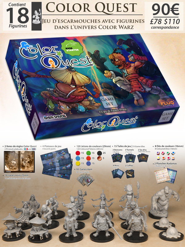 Color Quest est un nouveau jeu d'escarmouches pour deux joueurs avec figurines prenant place dans l'univers original de Color Warz. Le jeu a été édité pour la 1ère fois en 2017 sur Kickstarter et enrichi de contenu additionnel depuis lors à raison d'une campagne par an sur Game On Tabletop.