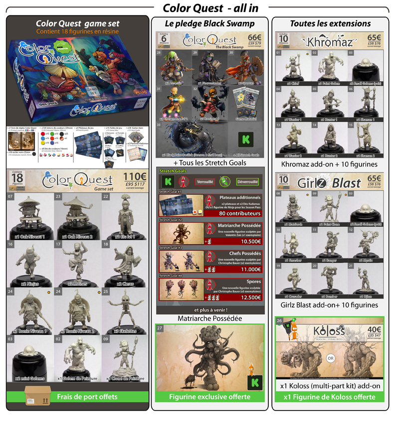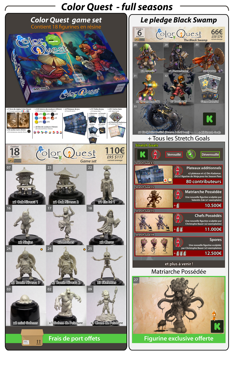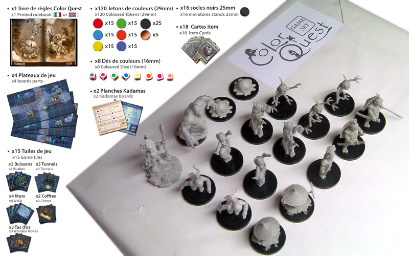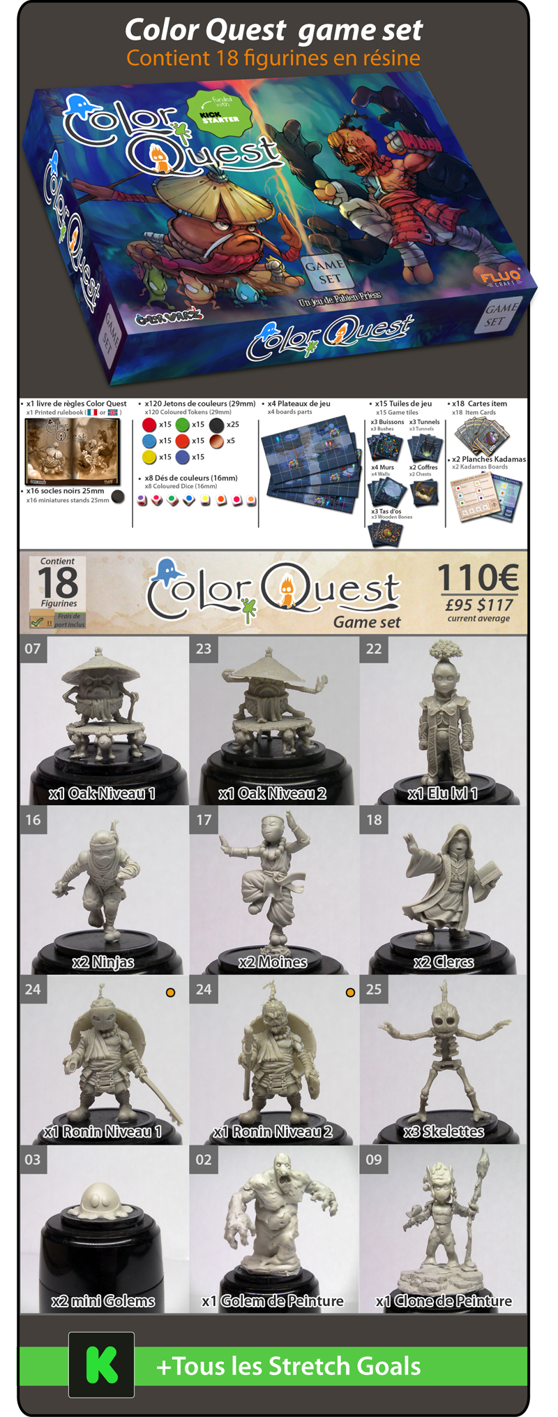 J'insiste sur le fait que, sauf succès massif, les produits Color Quest ne seront accessibles que pendant la durée des campagnes. Notre objectif est de vous proposer une à deux campagnes Color Quest par an en fonction du succès rencontré. Nous ne sommes plus structurés comme lors de FLUO Games pour alimenter une boutique internet. Nous ciblons donc ici un jeu de niche avec une communauté solide et fidèle (vous).