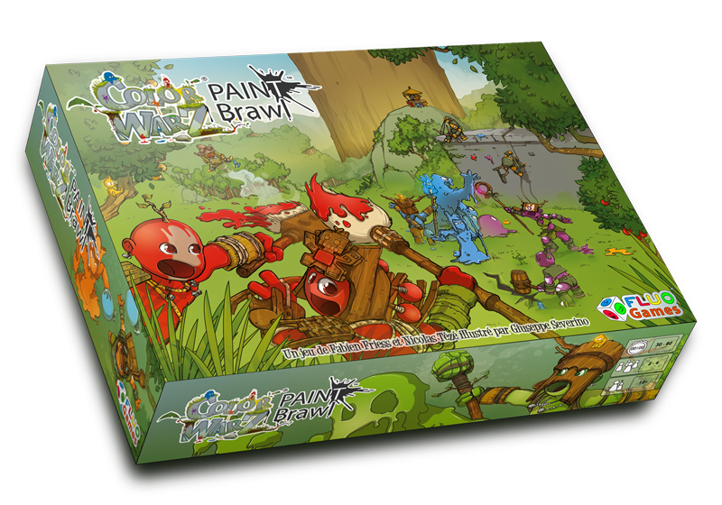 Color Warz - Paint Brawl, un jeu de plateau tactique pour 2 à 4 joueurs par Fabien Friess et Nicolas Tézé (FLUO Games 2012). Illustration de couverture : Gius.
